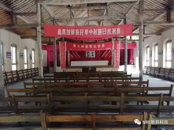 軍委禮堂位于舊址入口處,這是一座土木石結(jié)構(gòu)的平瓦房,整個禮堂可容納二百多人。它是由三五九旅一位木工設(shè)計,軍委和總部的工作人員自己動手建成的。禮堂的正中懸掛著毛澤東和朱德的畫像,一切還保持著當(dāng)年慶??箲?zhàn)勝利大會時的場景。
